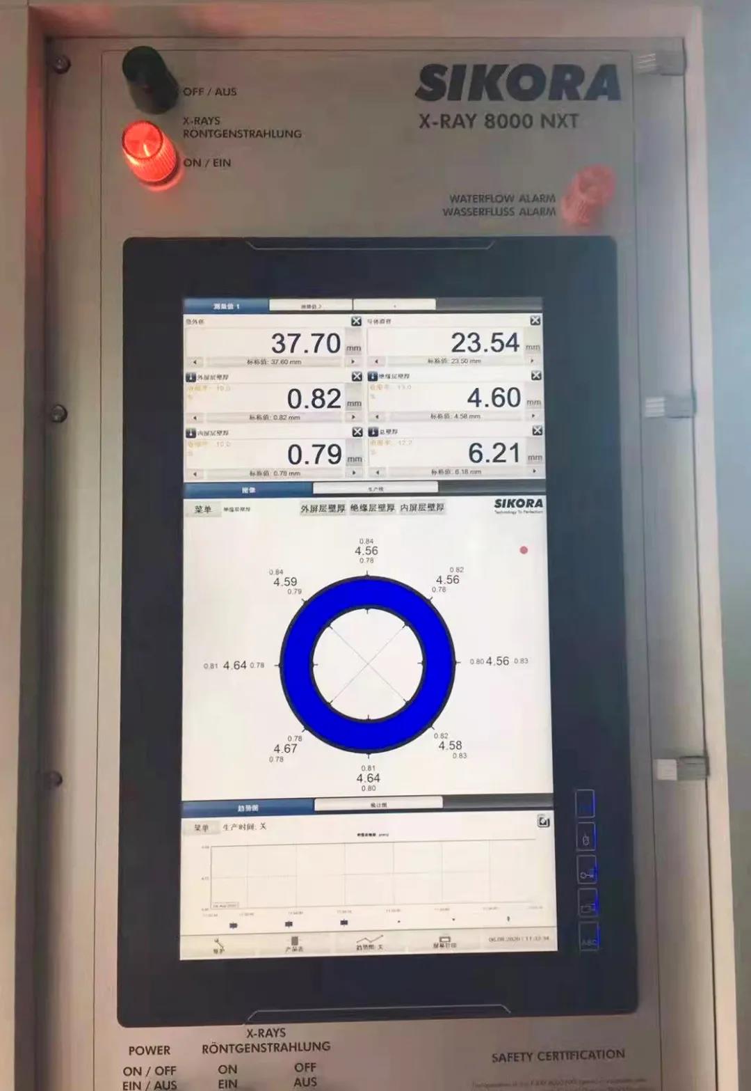“嚴把質量關,產品質量有保證。”公司還大力引進德國進口西科拉交聯管內電纜偏心壁厚分層辨析系統,在每一個掃描器上配備新一代的雙接收器的測偏儀,保證儀器在任何激烈電纜抖動情況下也能進行精確可靠的檢測,并采用全新的門控技術控制X射線的發射,X射線的轉換效率更高,操作溫度更低,從而保護射線管,生產過程實時監控中壓電纜內屏,絕緣,外屏三層擠出時采集八點厚度,精準實時監控絕緣外徑,從而提供高標準產品。
