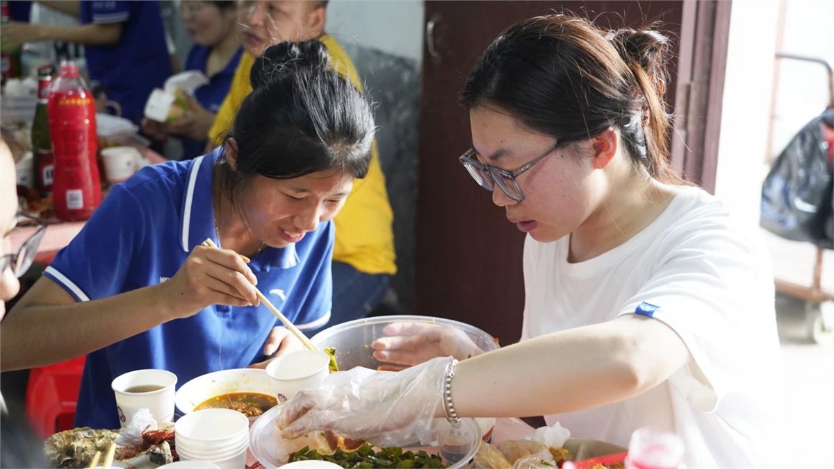 踏入餐廳,映入眼簾的是一盤盤美味的龍蝦、生蠔和飄香四溢的熱鹵、精致可口的小菜,還有清熱解渴的西瓜、冰鎮(zhèn)涼茶等。大家歡聚員工餐廳,圍桌而坐,歡聲笑語不斷,鮮嫩可口的海鮮在味蕾上綻放,一次次舉杯飽含喜樂、一聲聲歡笑傳遞幸福。