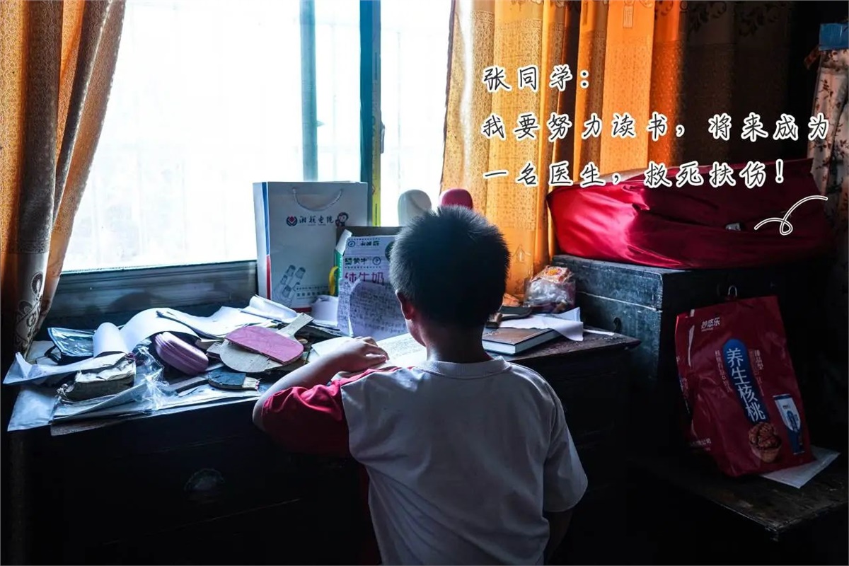 張同學:10歲,母親去世,父親患腎病綜合癥,無法勞動,需定期前往長沙醫院就診復查,家中還有年邁的奶奶,需要照顧贍養。盡管家庭經濟條件遇到困難,但其父依然十分重視教育,希望孩子能夠通過讀書改變命運。