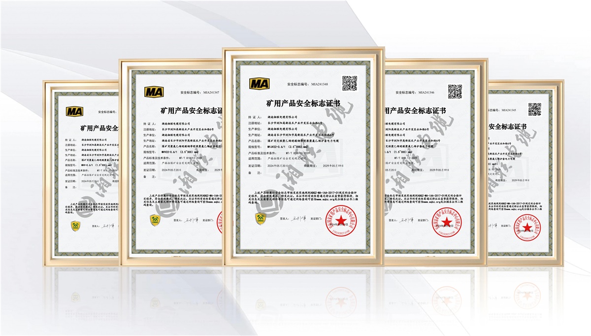 礦用電纜必須嚴格遵守國家及行業雙重標準,需按照GB/T 12972《礦用橡套軟電纜》、MT818-2009《煤礦用阻燃電纜》生產,都應經過安標國家礦用產品安全標志中心頒發礦用產品安全標志證書,才能向市場出售 。近期,湘聯電纜的MVV-0.6/1(1.5~300)mm2煤礦用聚氯乙烯絕緣聚氯乙烯護套電力電纜、MYJV-8.7/10(25~300)mm2煤礦用交聯聚乙烯絕緣聚氯乙烯護套等6款電力電纜成功取得礦用產品安全標志證書,其產品在阻燃、耐壓、抗拉強度等方面均達到行業標準。